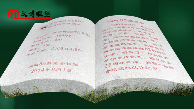 石雕书本、石雕书本图片、书本雕刻是人们常见的一种雕塑,也是人们喜爱的一种雕塑。因为书是人类用来记录一切成就的主要工具,也是人类交融感情,取得知识,传承经验的重要媒介,对人类文明的开展,贡献非常大。校园石雕有着特定的置放坏境和欣赏对象,因此其设计与其他类型环境中的雕塑设计有着根本的不同,首先,它应与整体校园环境相协调,塑造出宜人的、充满活力的校园环境品质,表现出雕塑与校园环境的有机结合的环境性。其次,校园雕塑处于校园公共艺术环境之中,是在校师生学习生活空间的一个重要组成部分,和其它类型雕塑一样具有一定的公共性和艺术性特征。是大学校园雕塑的引导性和教育性,校园雕塑在满足师生感官追求的同时,还可以体现时代特征,表达时代精神,引导师生净化心灵、思想追求。